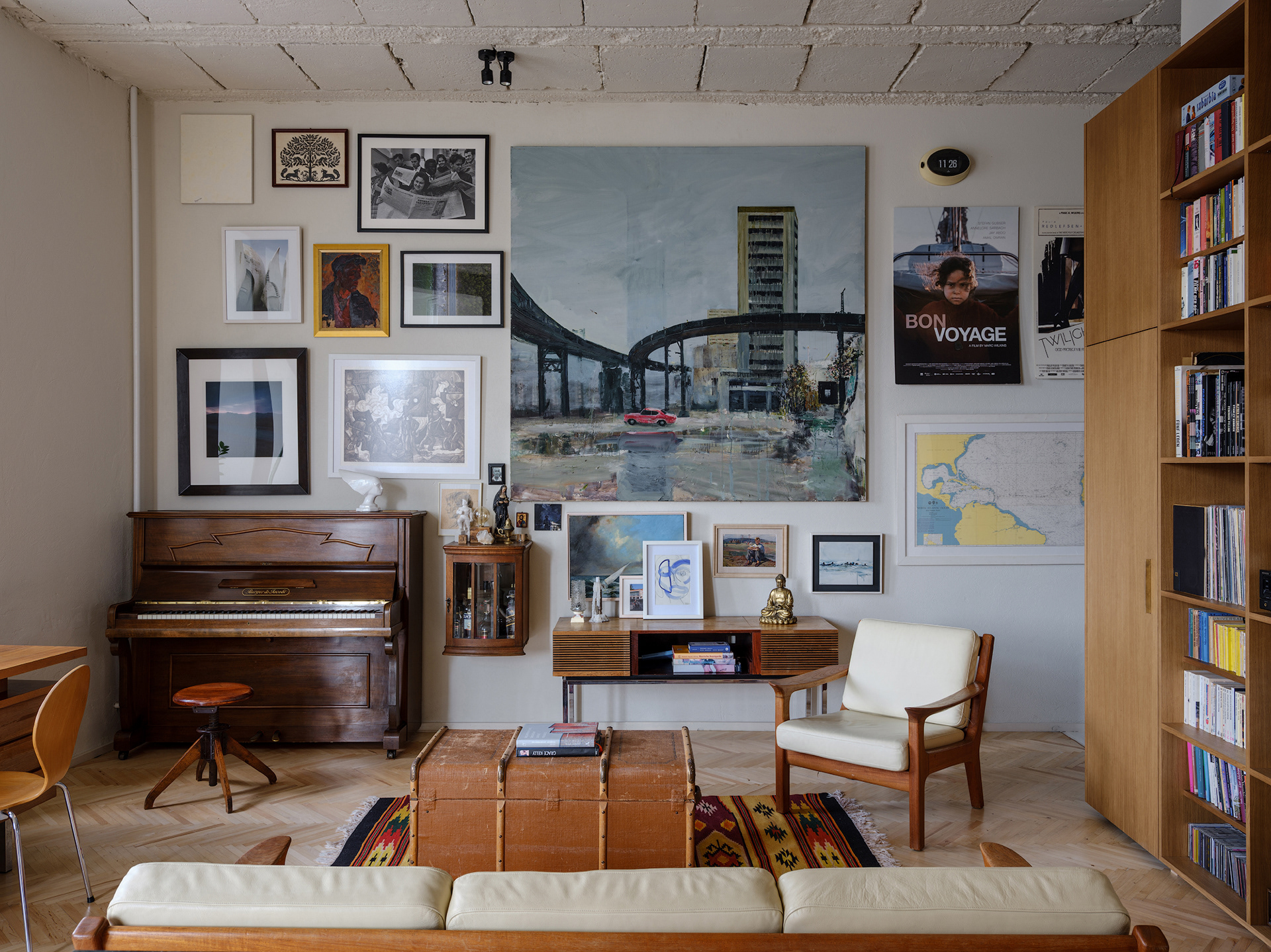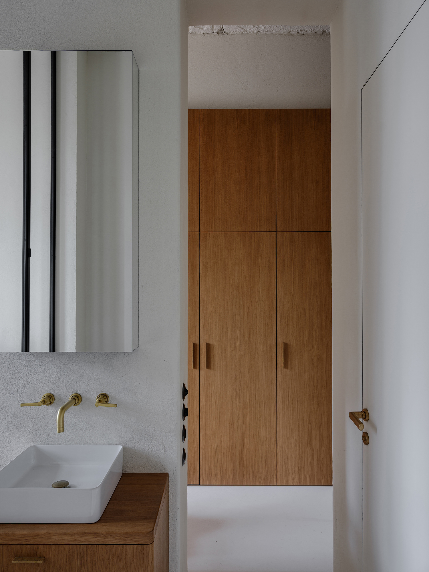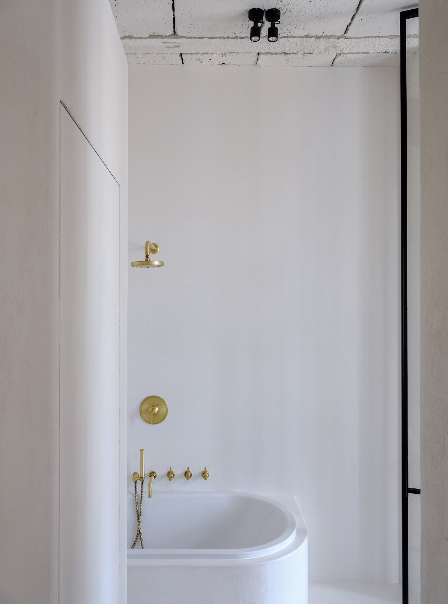 The apartment located on the fifth floor of a pre-revolutionary period (the early 20th century) apartment building in the heart of Kyiv was designed by Emil Dervish for his friend Marc Raymond Wilkins. The owner of the apartment is a talented filmdirector who previously lived in New York and Berlin but decided to move to Reytarska, the most beautiful street in Kyiv. The apartment features high ceilings (3.7m) and unusual shape. The name of the apartment Birdsnest is explained by the fact that it is located on the top floor in a tower with a cone-shaped roof. The finishing of the apartment focuses on a creating a cozy atmosphere − warm wood textures, ivory plaster walls, and ceiling made of old concrete blocks, brass elements. The pieces of furniture and such details as window and door handles were specially designed for this project, sofa and armchairs were transported from Berlin. The kitchen sink used to belong to Marc's great-grandfather, and the piano used to belong to his mother. The apartment is decorated with a range of vintage pieces, unique prints, and paintings, for example, the portrait of a man in the bedroom is a painting by the owner's father.