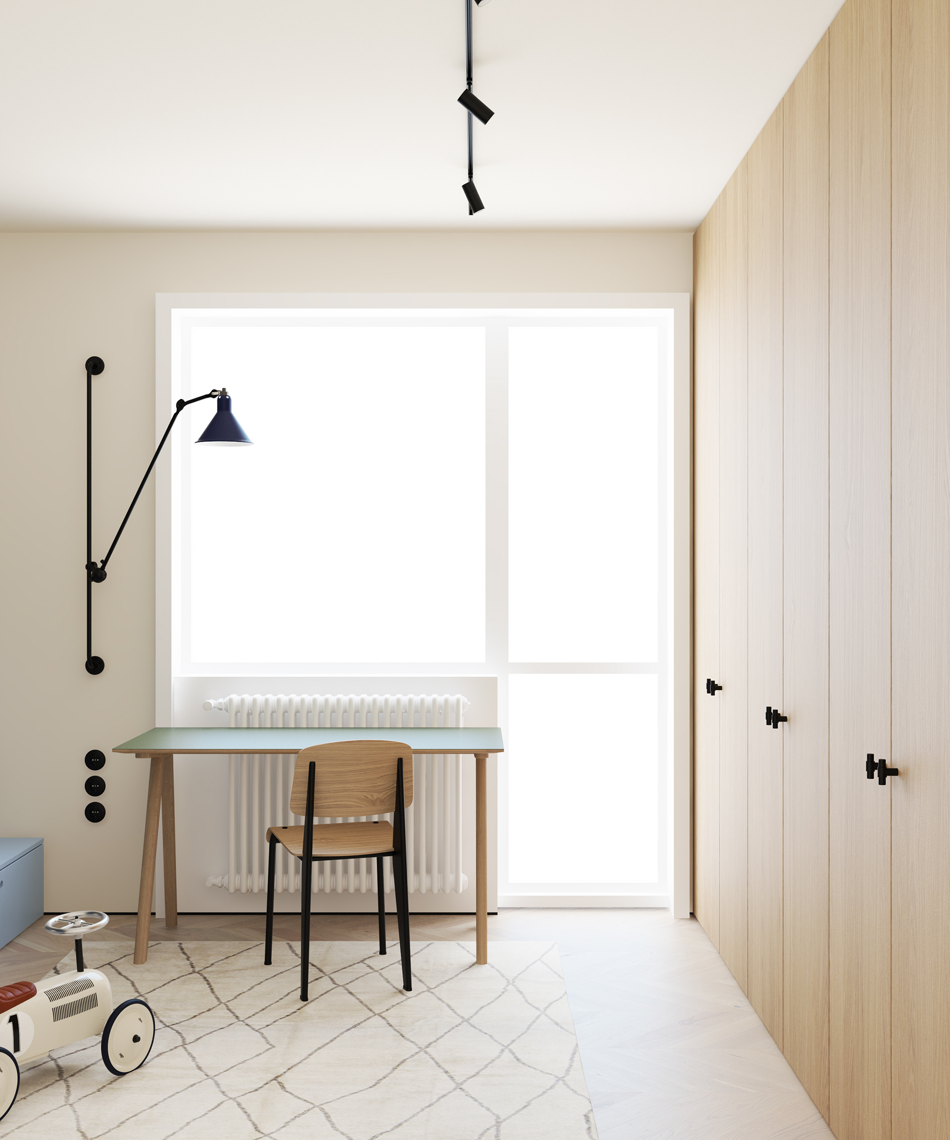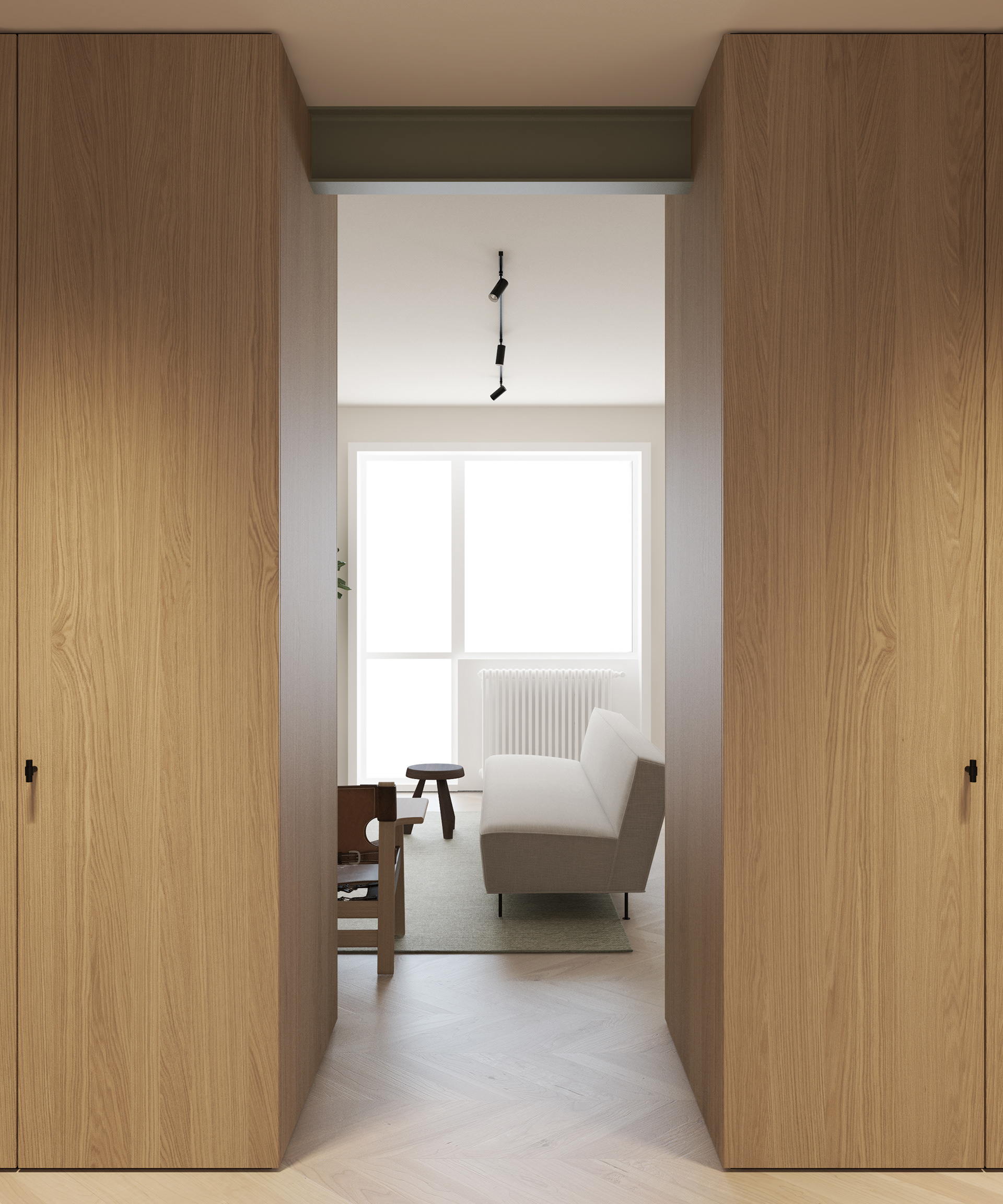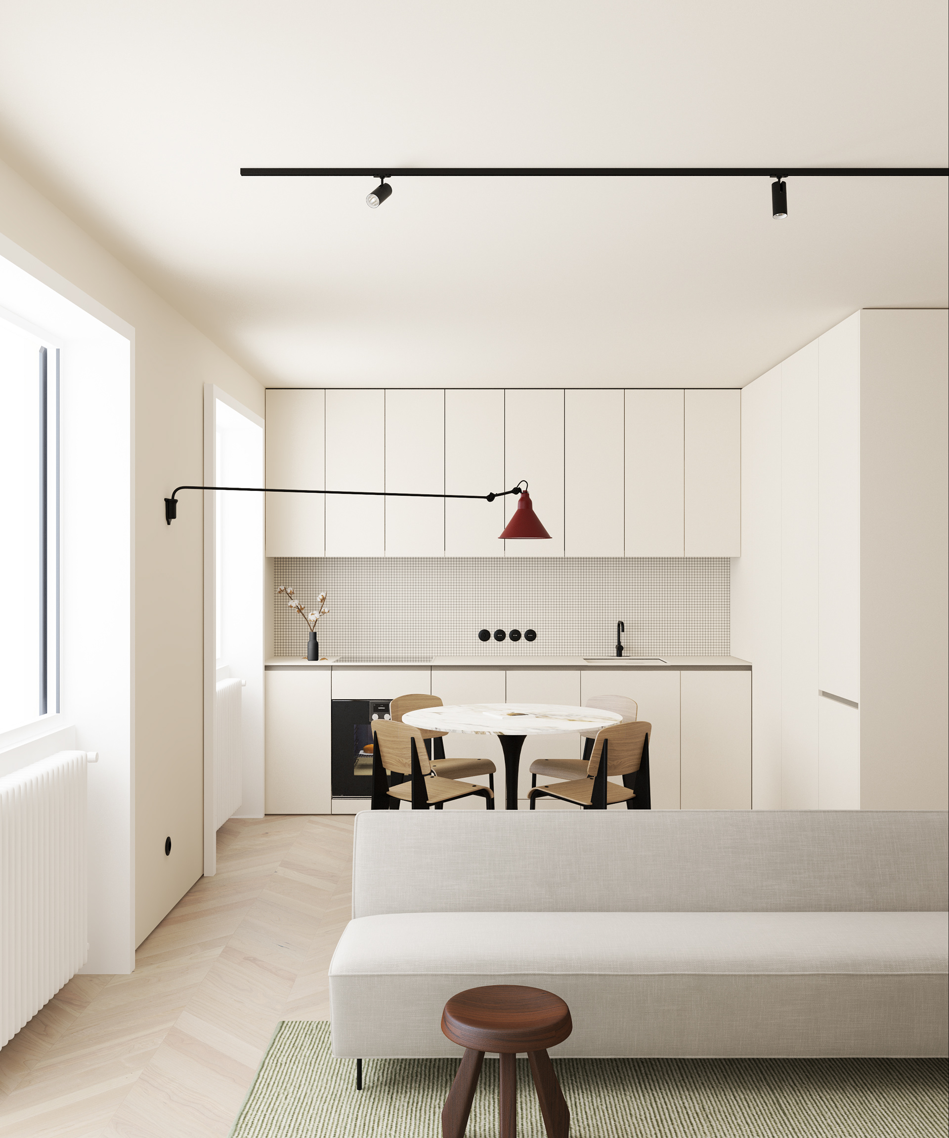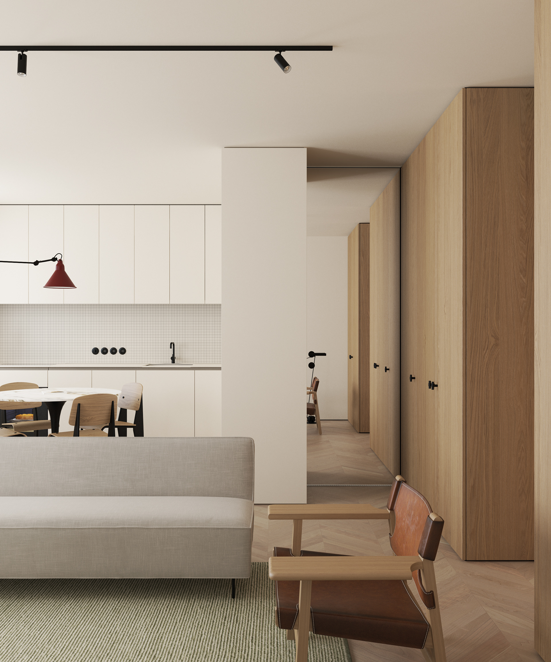 Copenhagen is a minimalist interior located in Copenhagen, Denmark. The space is characterized by natural tones and materials and utilizes built-ins to form partitions and additional storage space. Herringbone floors are laid out throughout the home, with small square tiles lining the floors and walls of the bathroom. The open floor plan allows natural light to spread throughout the space, and provide a more open and welcoming environment for guests.
