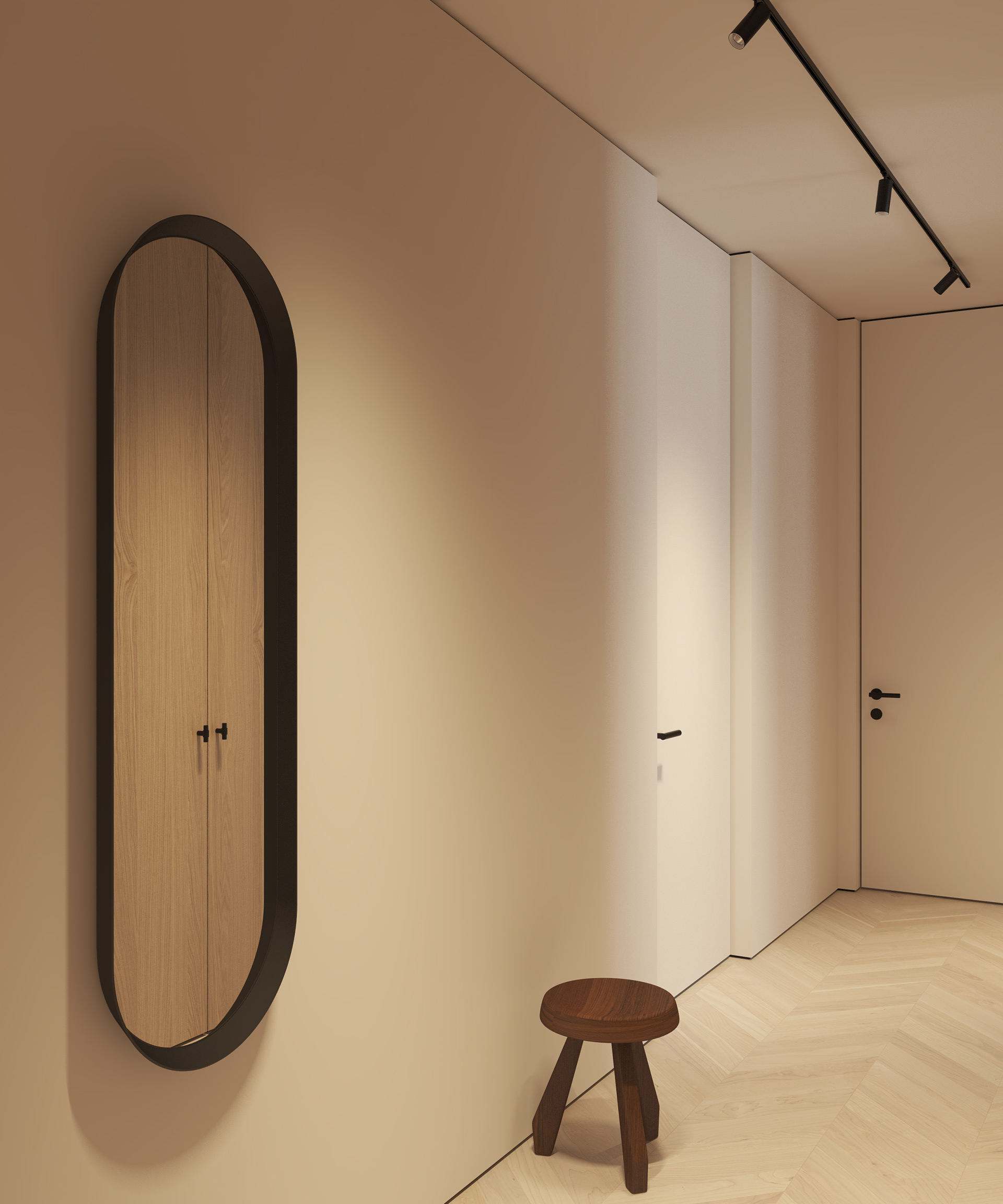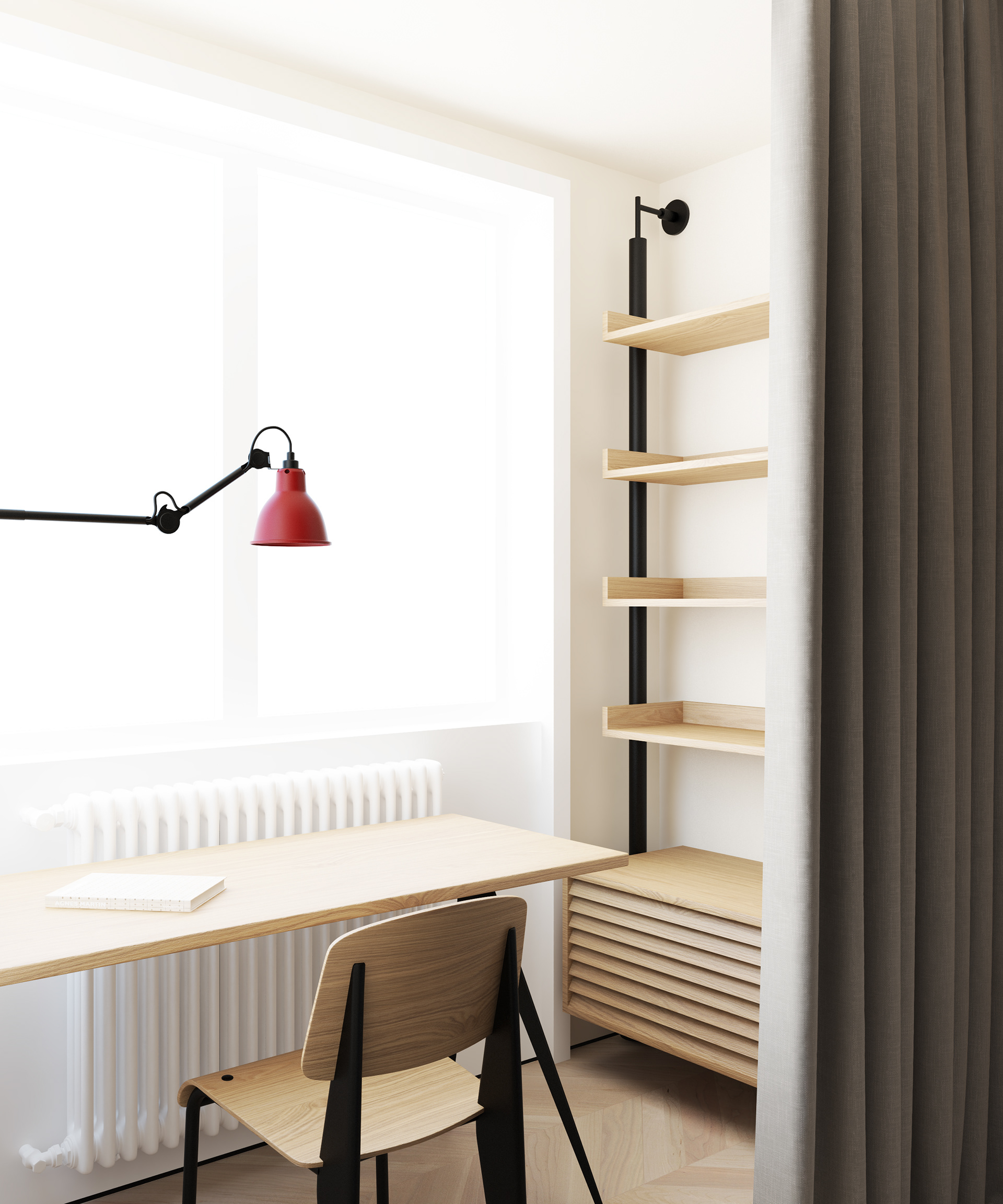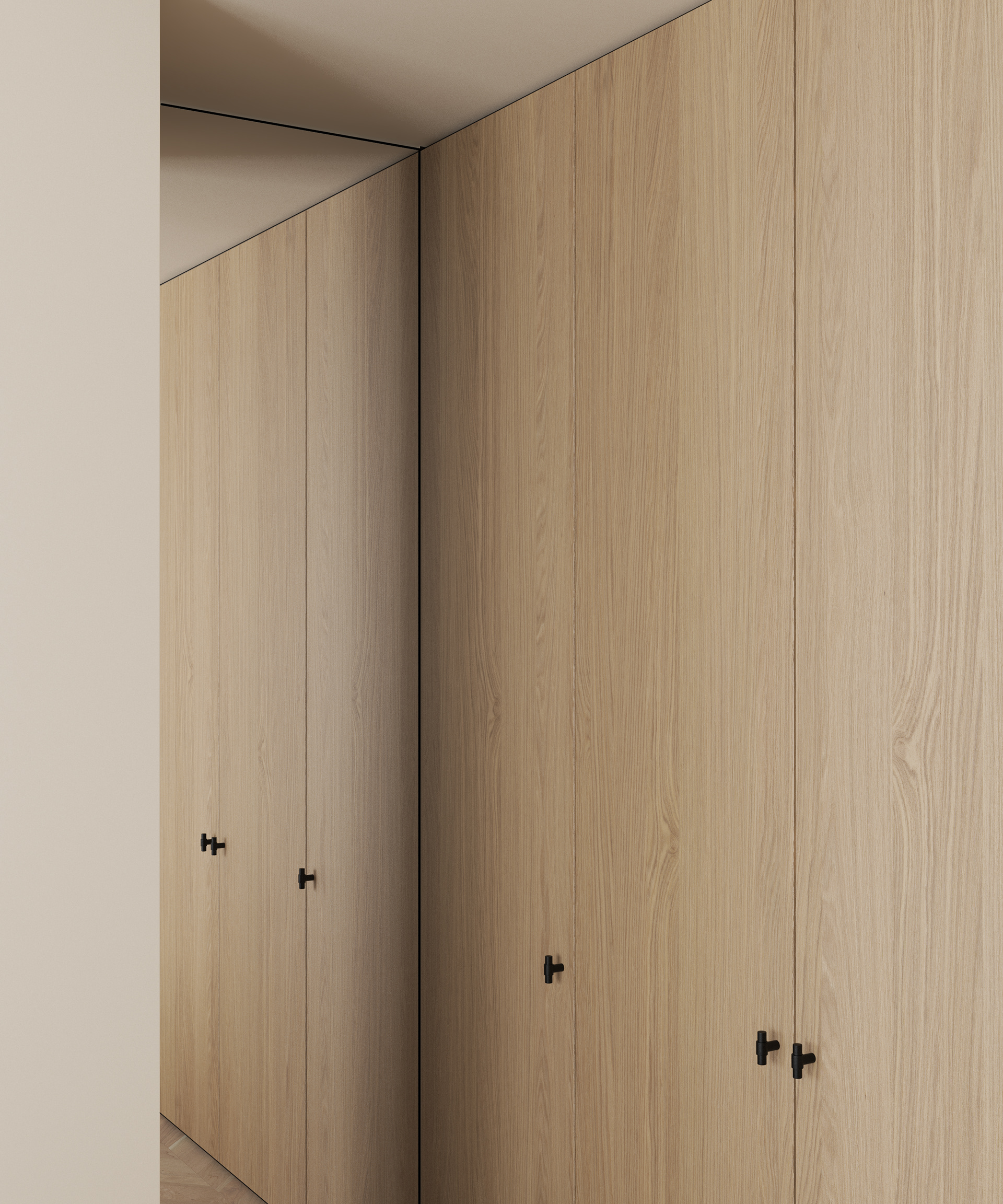 Copenhagen is a minimalist interior located in Copenhagen, Denmark. The space is characterized by natural tones and materials and utilizes built-ins to form partitions and additional storage space. Herringbone floors are laid out throughout the home, with small square tiles lining the floors and walls of the bathroom. The open floor plan allows natural light to spread throughout the space, and provide a more open and welcoming environment for guests.