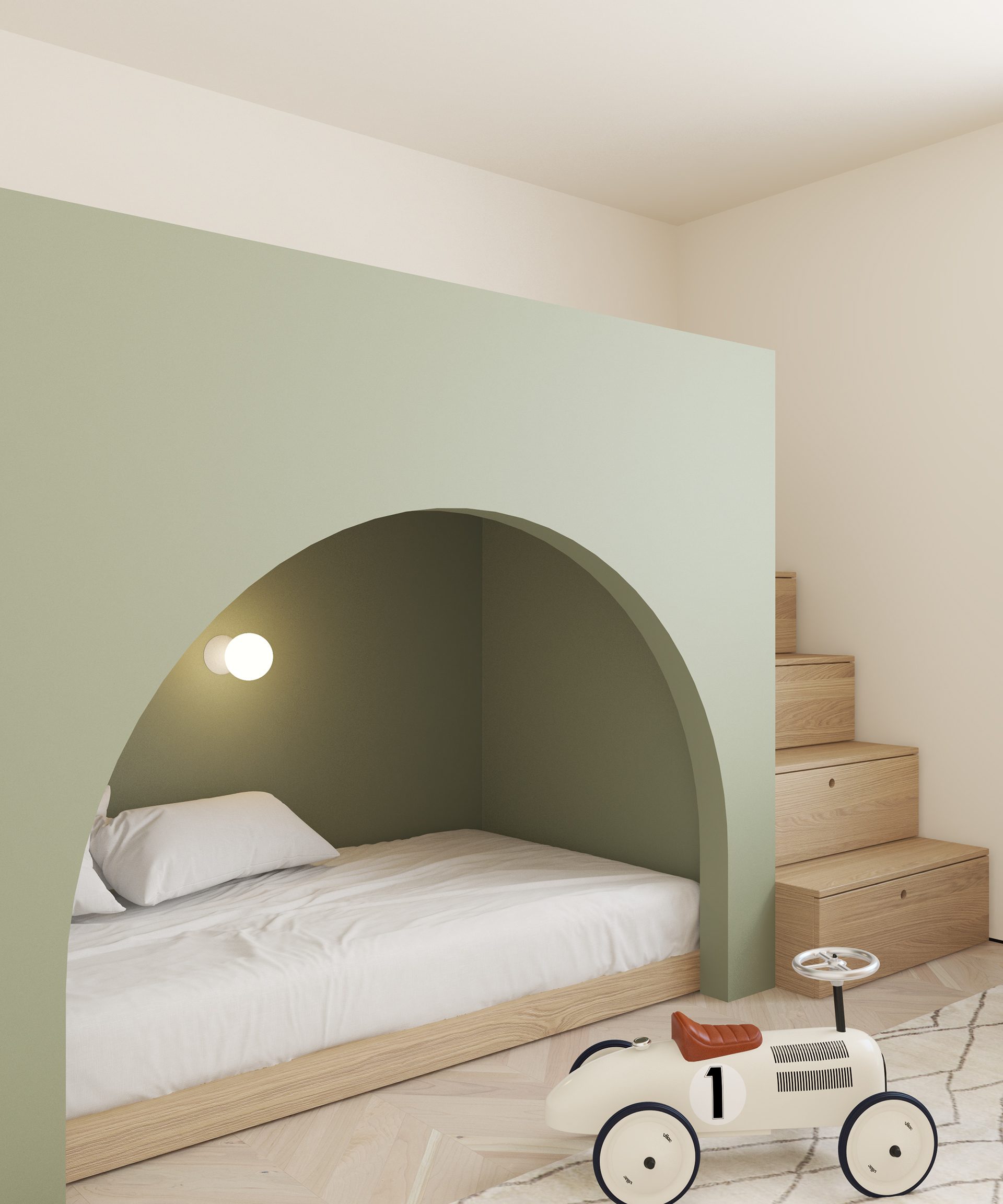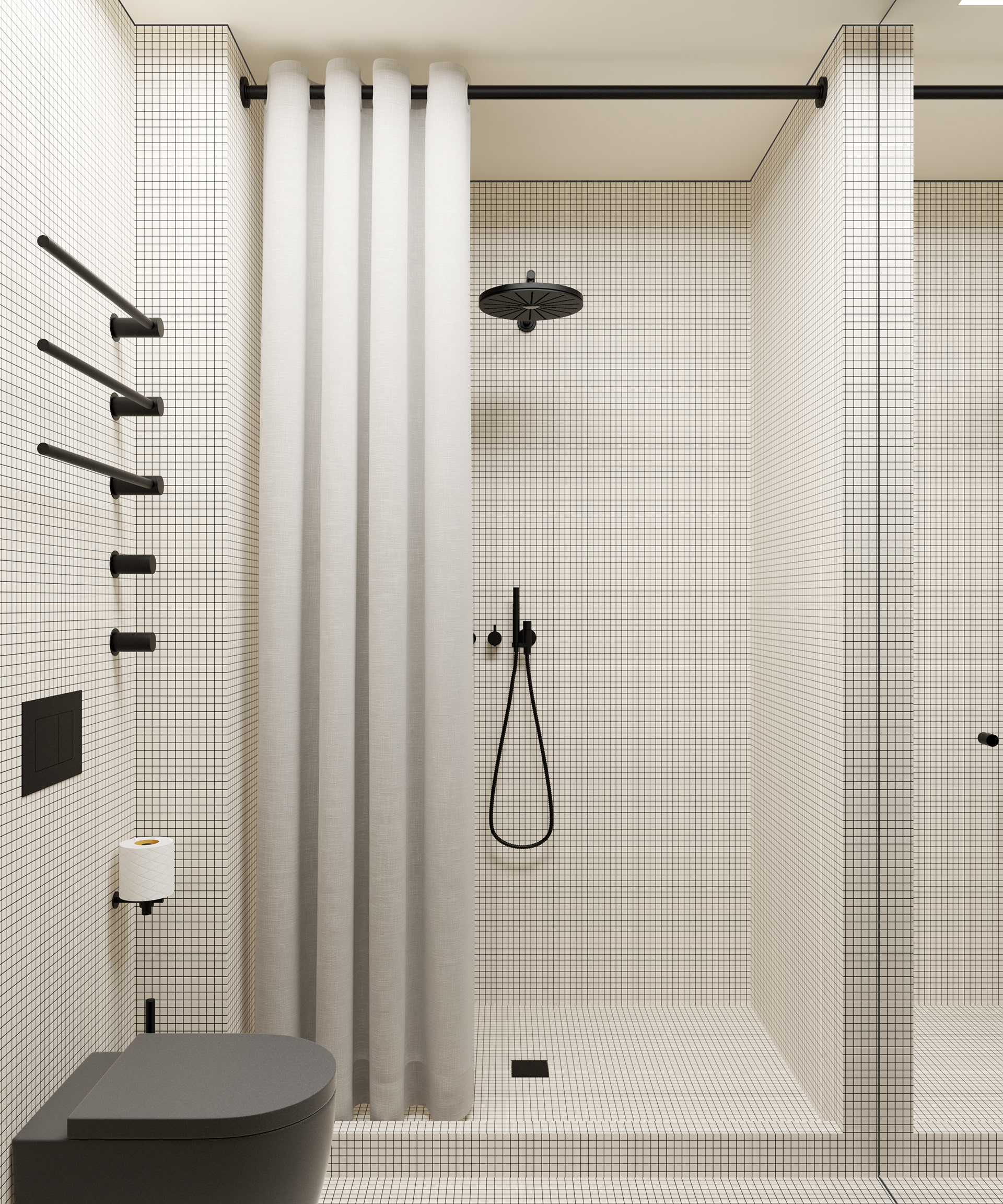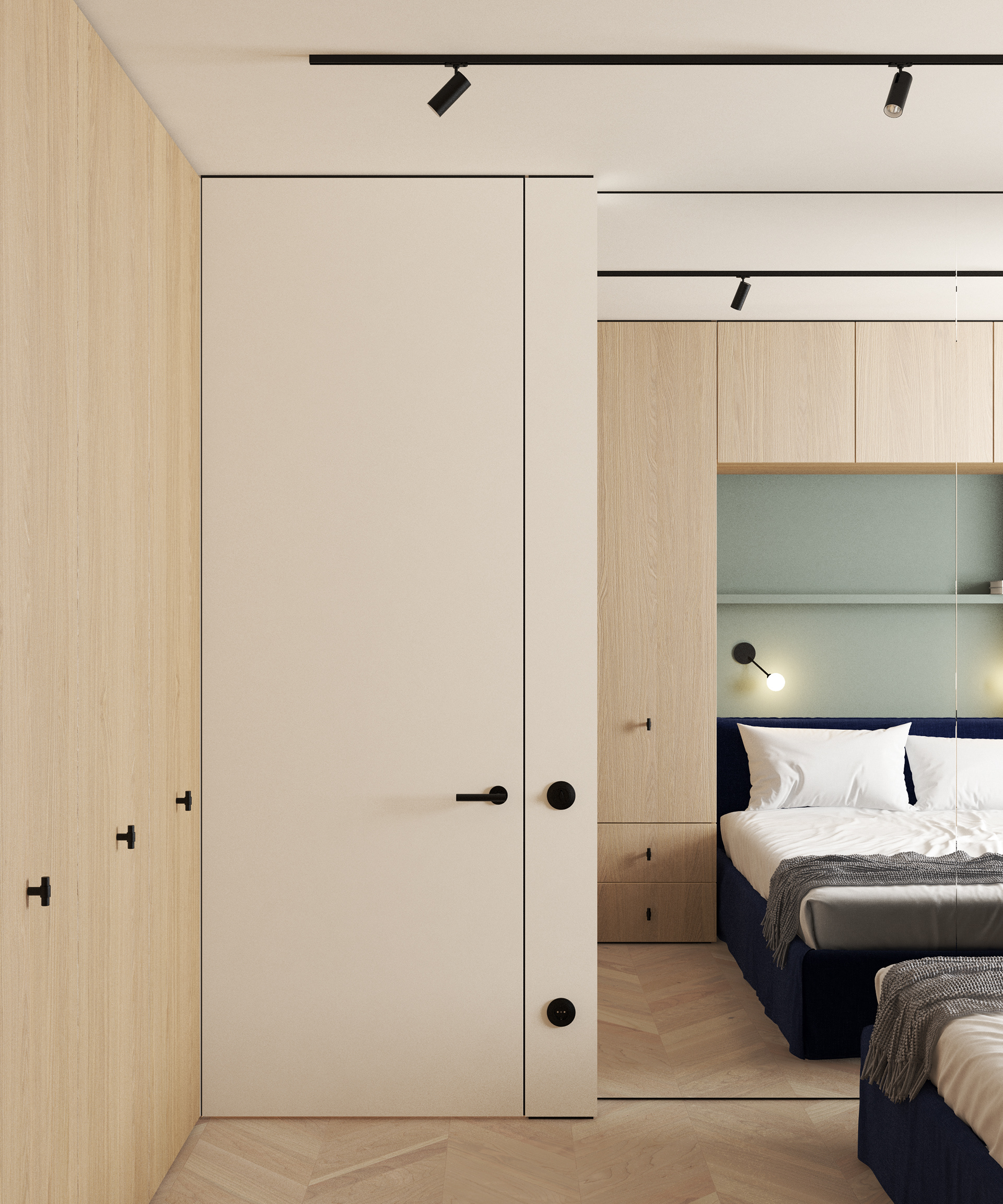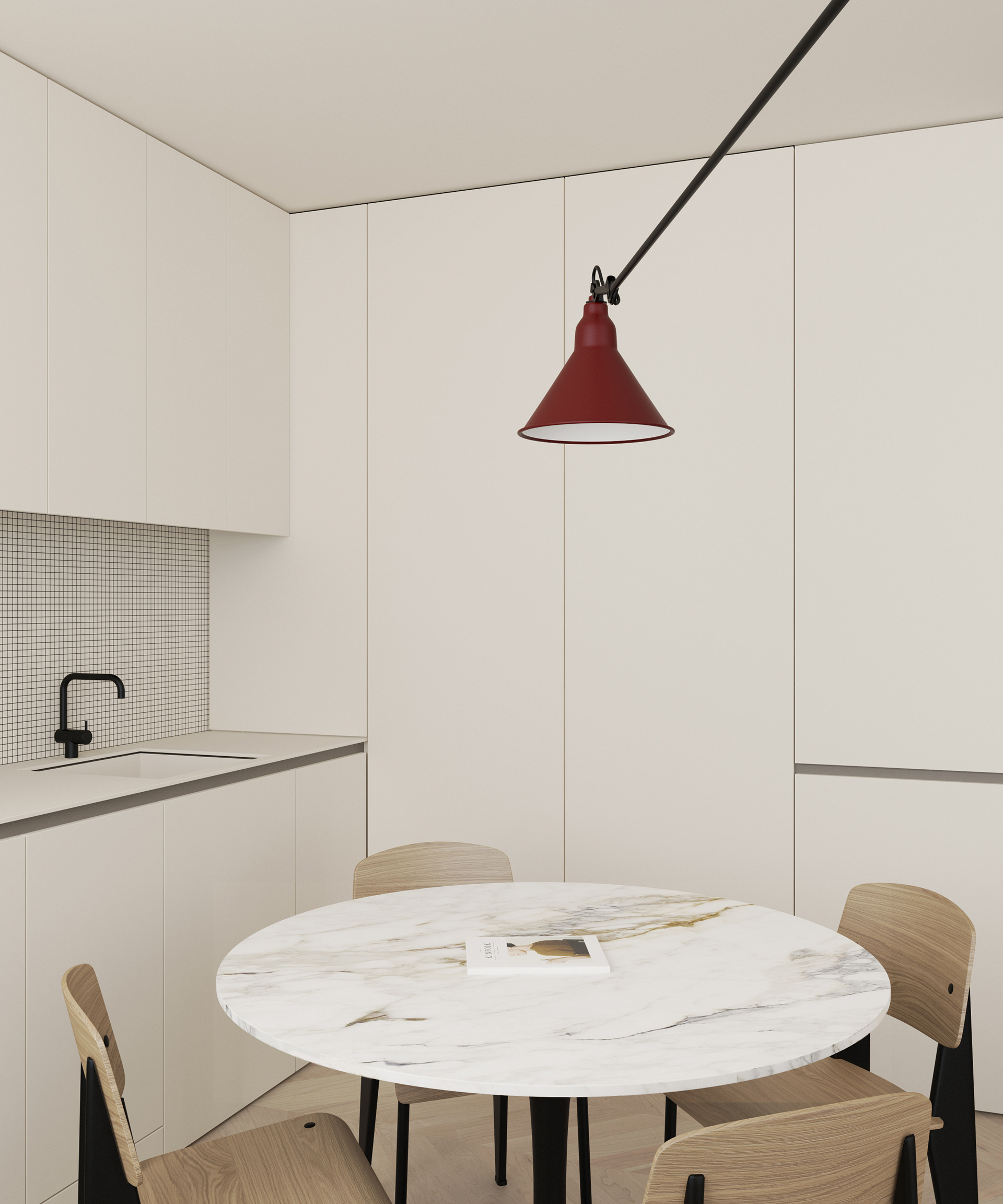 Copenhagen is a minimalist interior located in Copenhagen, Denmark. The space is characterized by natural tones and materials and utilizes built-ins to form partitions and additional storage space. Herringbone floors are laid out throughout the home, with small square tiles lining the floors and walls of the bathroom. The open floor plan allows natural light to spread throughout the space, and provide a more open and welcoming environment for guests.